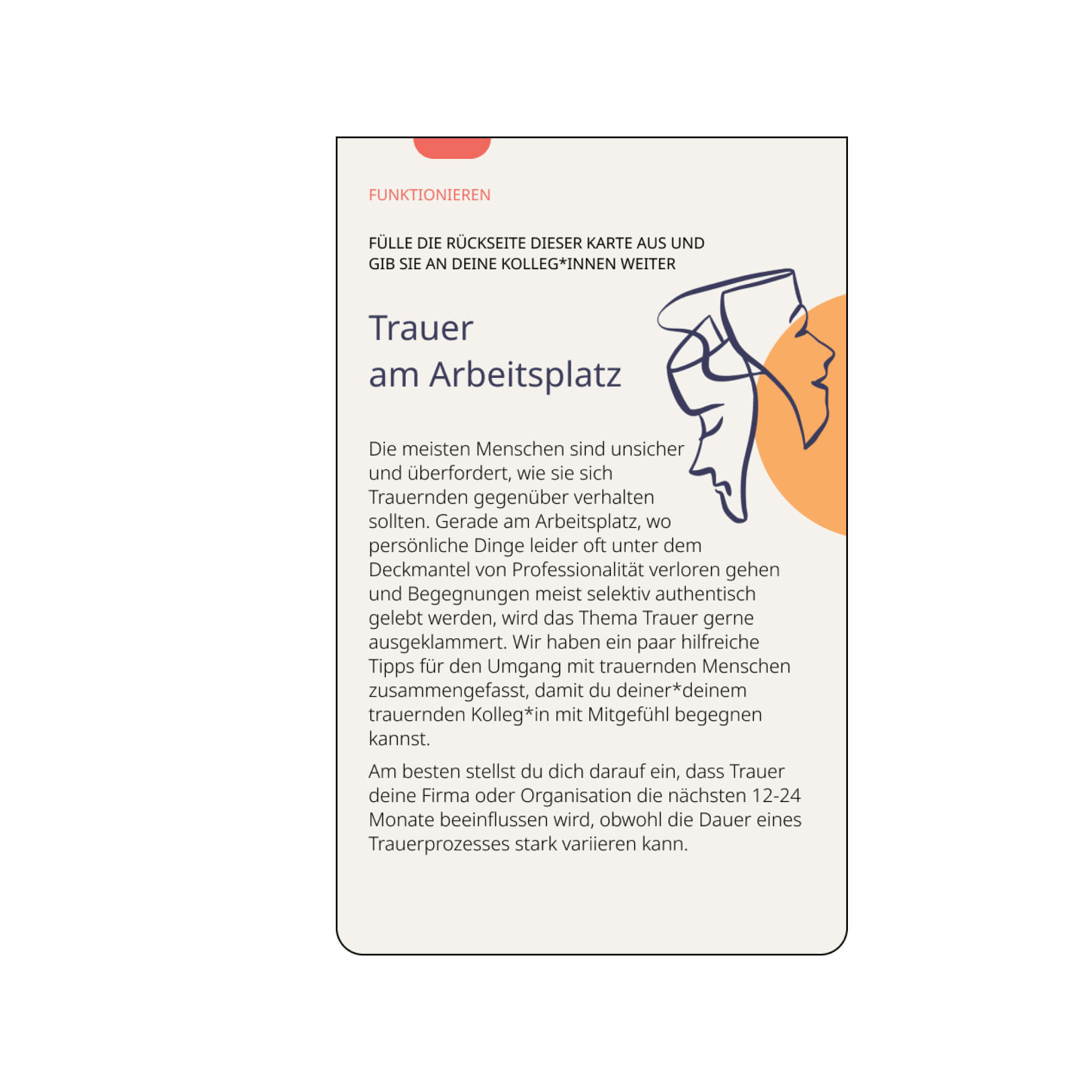 Das Kartenformat zielt auf die Individualität von Trauer ab. Die trauernde Person entscheidet selbst, welche Inhalte wann hilfreich sind und kann so in Eigenregie die passgenaue Unterstützung für seinen oder ihren individuellen Trauerweg gestalten.