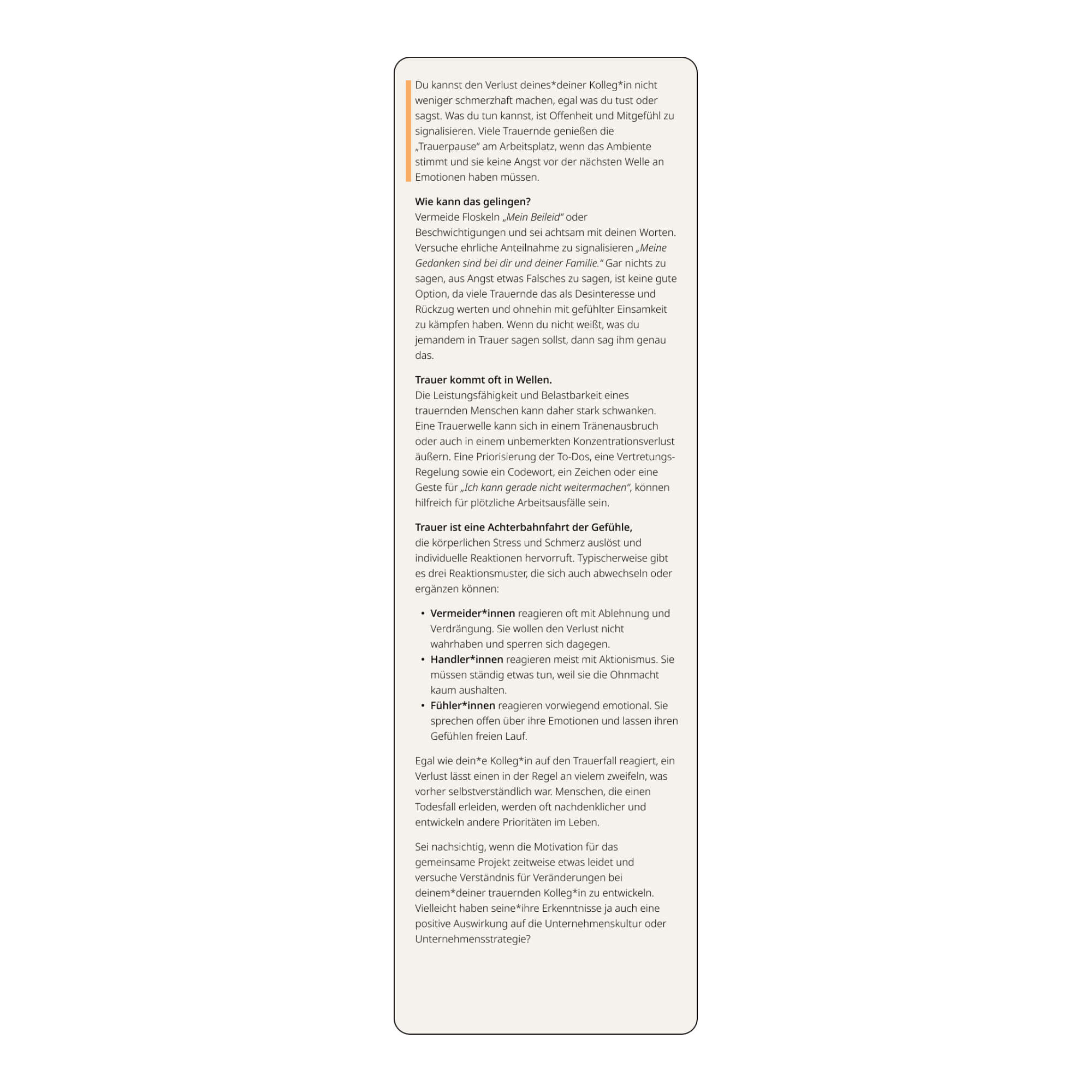 - Jeder Trauerweg ist individuell, und Karten sind handlich, flexibel und pragmatisch. Die Trauernden können so selbst entscheiden, welche Inhalte in welcher Reihenfolge hilfreich sind.