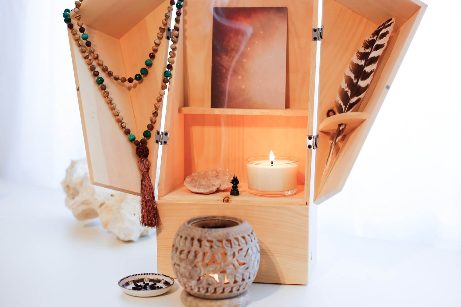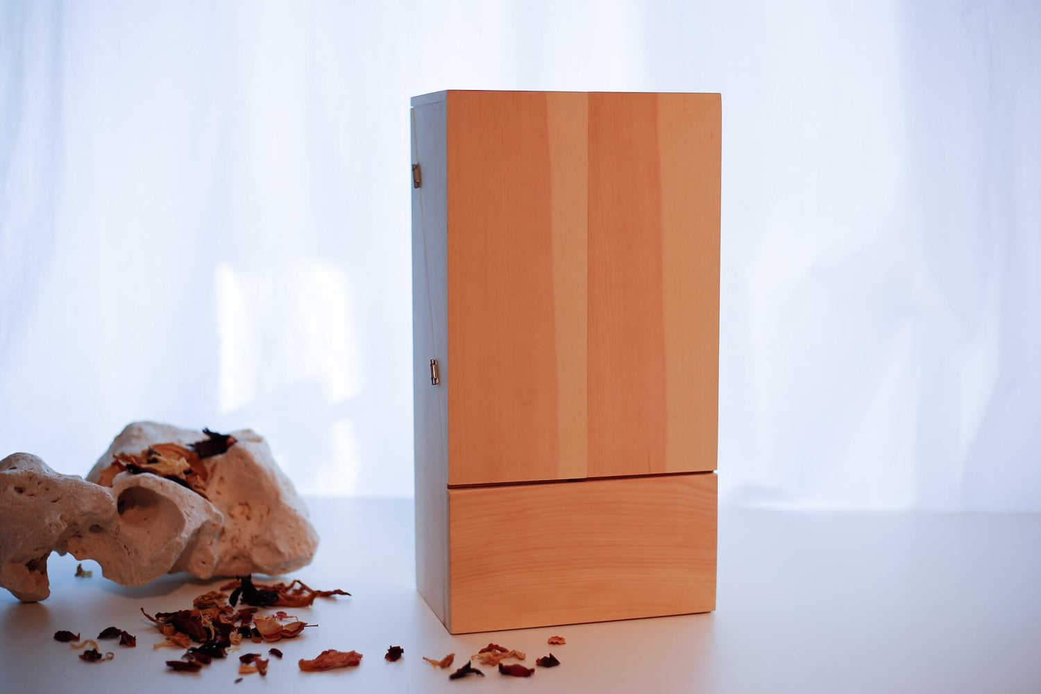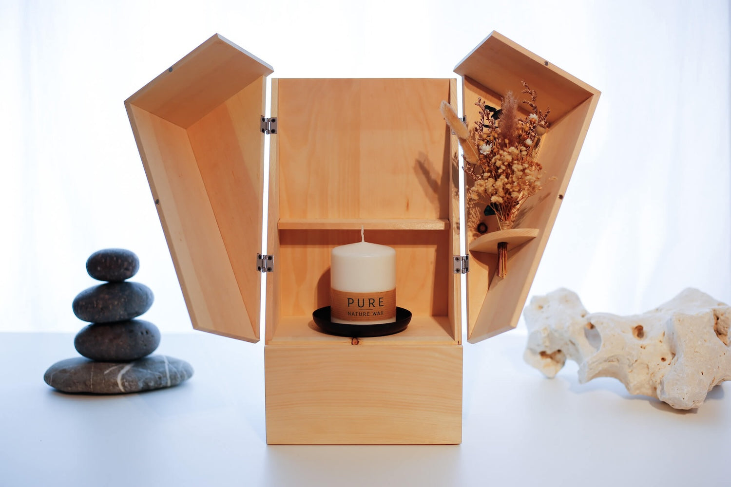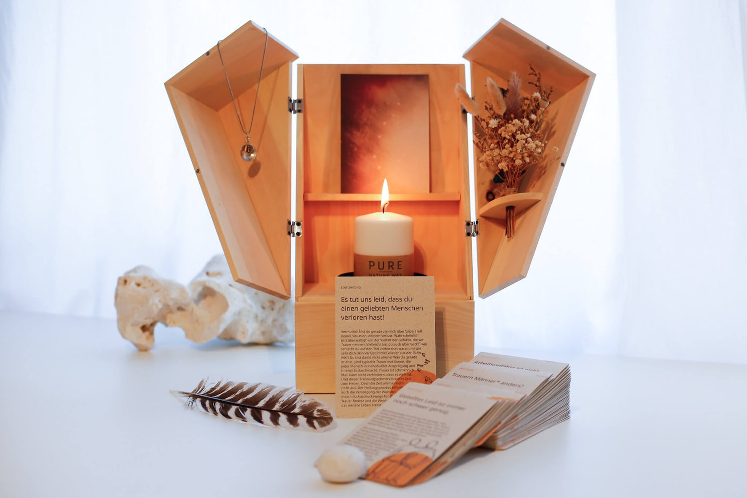 Der Gedenkraum aus Zirbenholz kommt mit einer Kerze aus Rapswachs, Trockenblumen und einer Kondolenzkarte.