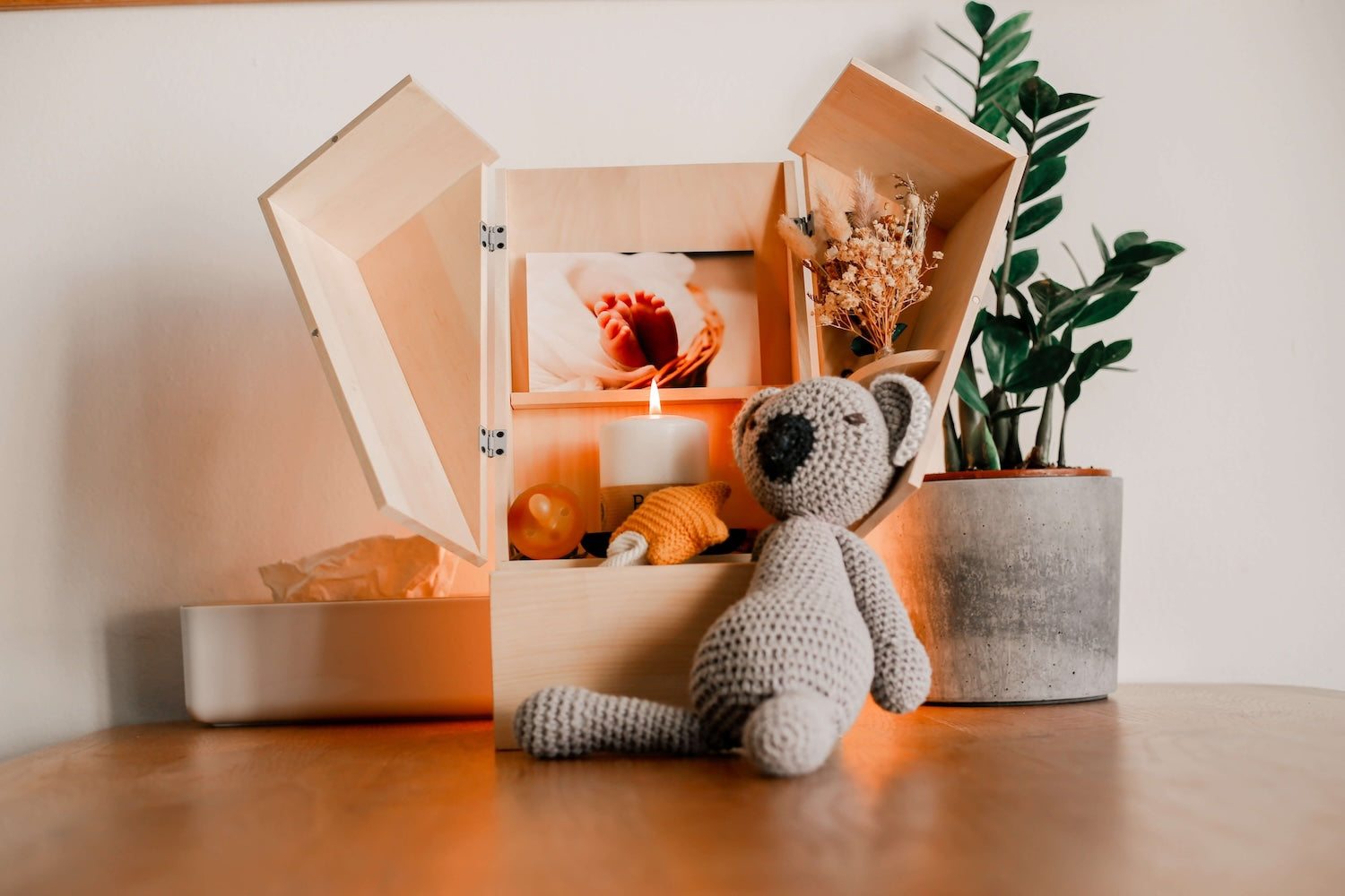 Der Gedenkraum aus Zirbenholz enthält eine Kerze aus Rapswachs, Trockenblumen, einen Platz für ein Foto sowie für Erinnerungsstücke und eine Kondolenzkarte.